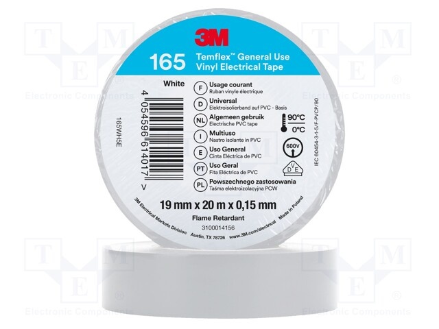Лента: электроизоляционная; W: 19мм; L: 20м; Thk: 0,15мм; белый; 200%