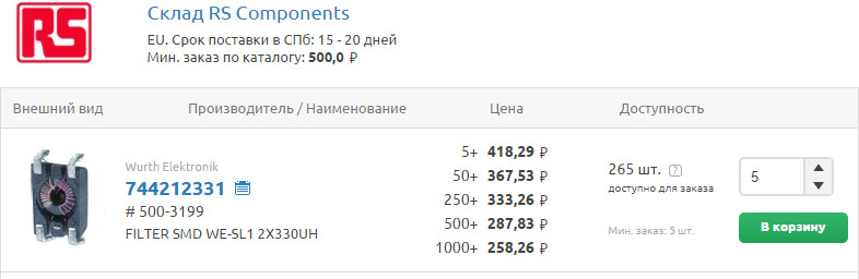 Ищите склад RS Components в результатах поиска и вариантах поставки компонентов: