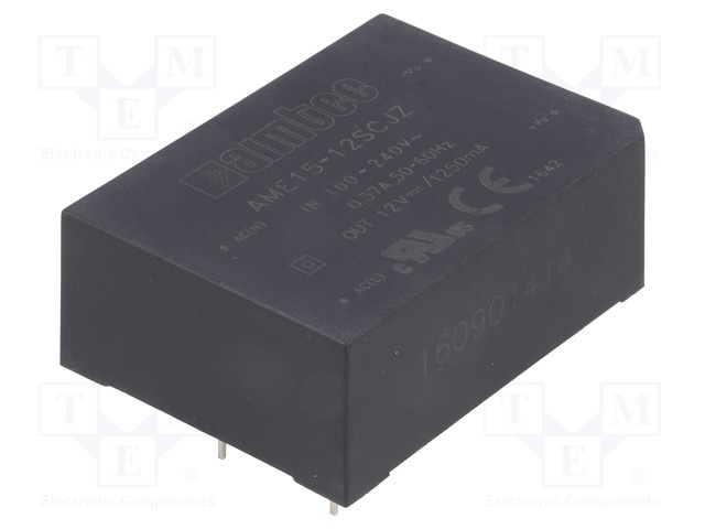 Преобразователь: AC/DC; 15Вт; Uвых: 12ВDC; Iвых: 1,25А; 80%; 3кВ; 85г