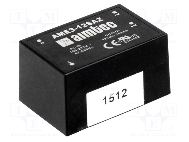 Преобразователь: AC/DC; 3Вт; Uвых:12ВDC; Iвых:0,25А; 73%; 25г; 3кВ