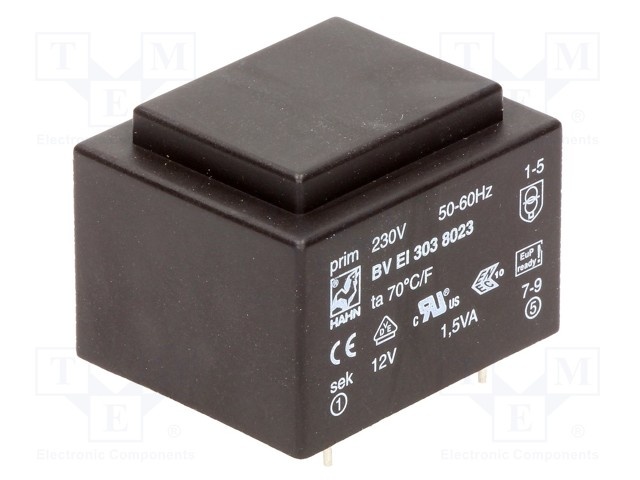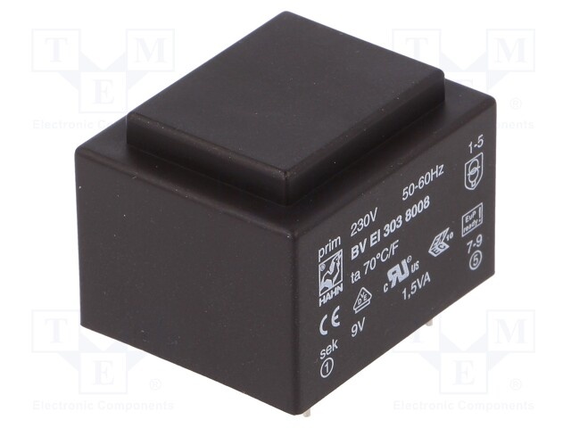 Трансформатор: залитый; 1,5ВА; 230ВAC; 9В; 167мА; Монтаж: PCB; 81г